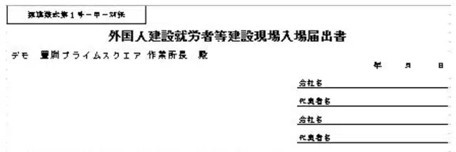 書式の左側上部の提出先は「○○ビル作業所長」や「××工事事務所長」等、現場の責任者宛てとします。書式の右側には、届出書を作成した日付の下に、一次下請会社の会社名と責任者の役職・氏名を記載し、その下に外国人就労者等を受け入れる下請会社の会社名と責任者の役職・氏名を記載します。