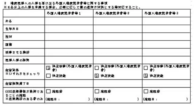 「2 建設現場への入場を届け出る外国人建設就労者等に関する事項」には入場を申請する「外国人就労者等」全員について以下の項目を記載します。なお、入場申請が4名以上となる場合は、欄を追加するか別紙を作成して同じ項目を記載のうえ提出してください。