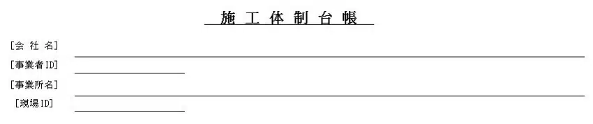 文書タイトル「施工体制台帳」の下にある「会社名・事業者ID」の欄には、元請会社の会社名と、CCUS(建設キャリアアップシステム)に加入している場合は事業者IDを記入します。