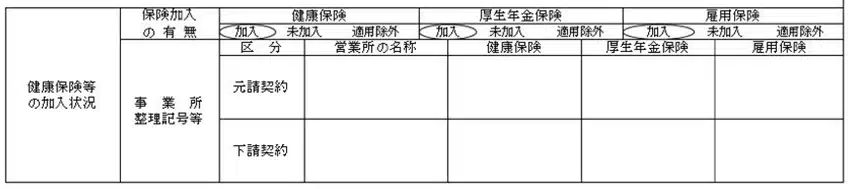 元請会社が健康保険、厚生年金保険、雇用保険への加入の有無を「加入」「未加入」「適用除外」のなかから選択します。また、元請契約をした事業所と下請け契約をした事業所が異なる場合は、それぞれの事業所で加入している保険組合名、または事業所整理番号、厚生年金と雇用保険の事業者整理番号を記入します。