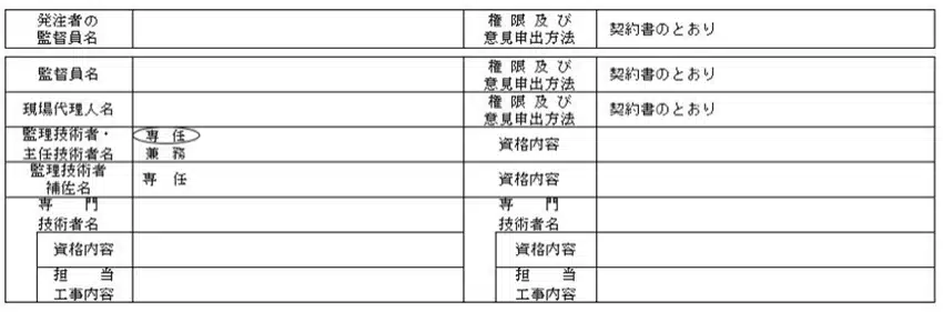 元請業者が専門技術者を配置する場合は専門技術者の氏名、保有する資格内容、担当する工事の内容を記入します。