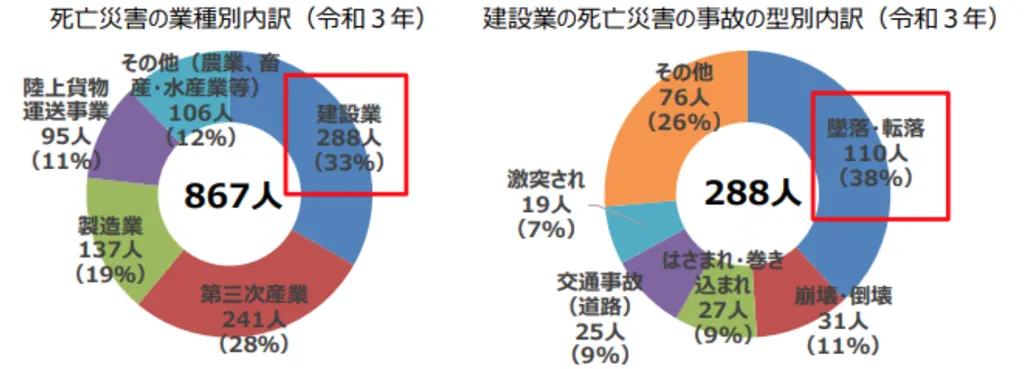 建設現場では不安定な高所での作業が多く、さまざまな事故が発生しやすい環境にあります。厚生労働省が発表した『令和3年の労働災害発生状況』のうち「死亡災害の業種別内訳」をみると、死亡者数867人のうち建設業の死亡者数は288人となっており、全体の33%をも占めています。また、「建設業の死亡災害の内訳」を見ると、死亡者数288人のうち110人が「墜落・転落」によるもので38%を占めており、「崩壊・倒壊」が31人(11%)、「はさまれ・巻き込まれ」が27人(9%)と続いています。