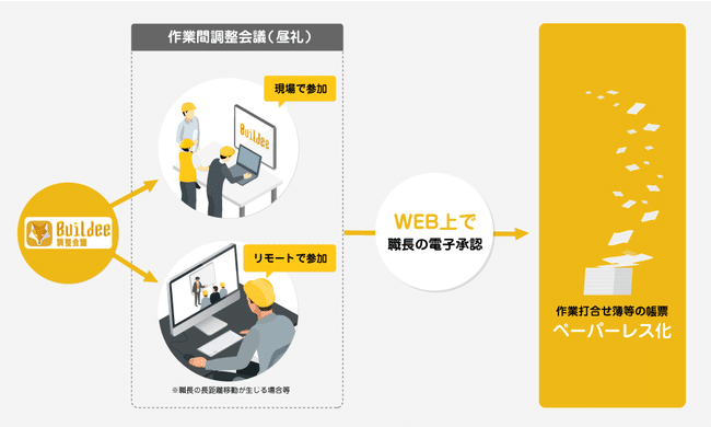 そこで、西松建設は、これらの課題解決と更なる効率化を目指すために、イーリバースドットコムが開発した『Buildee調整会議』の電子承認機能を活用し、「作業打合せ簿等の現場帳票ペーパーレス化」と「作業間調整会議のリモート化」する取り組みを開始しました。