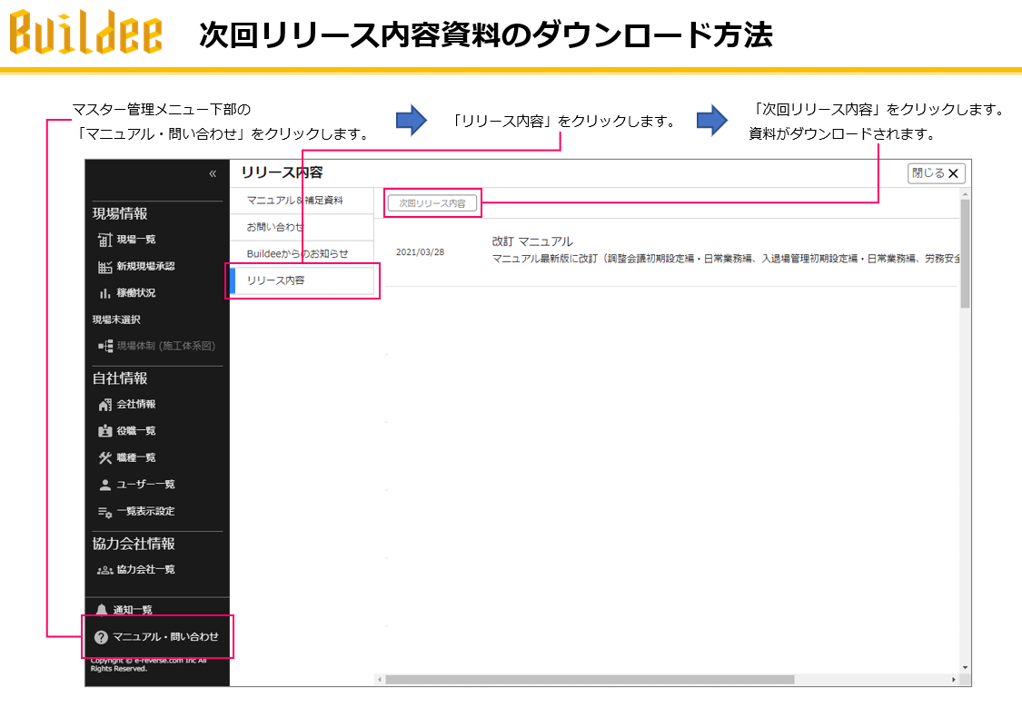 なおリリース内容につきましては、Buildeeログイン後の以下画面より資料をご確認ください。